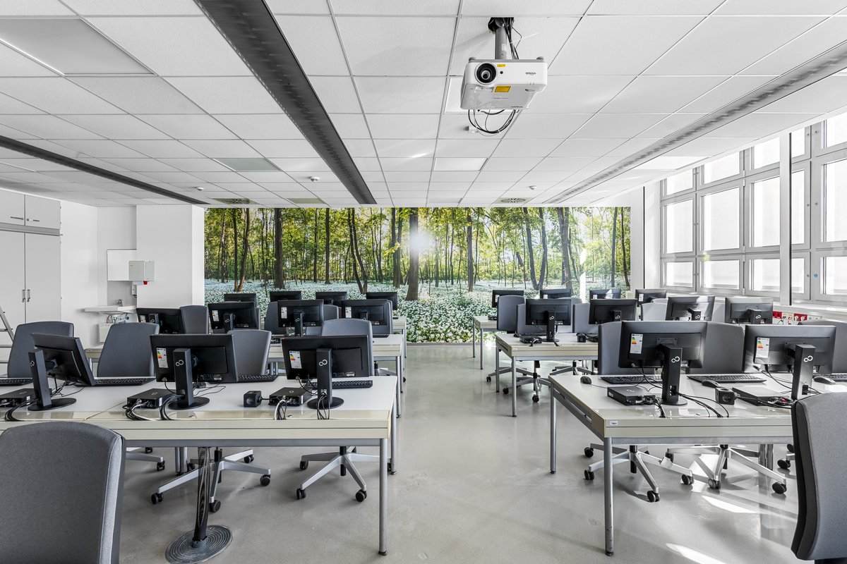 Sein Waldpanorama verwandelt den nüchternen Computerraum in einen Ort, der zum Verweilen und kreativen Arbeiten einlädt.