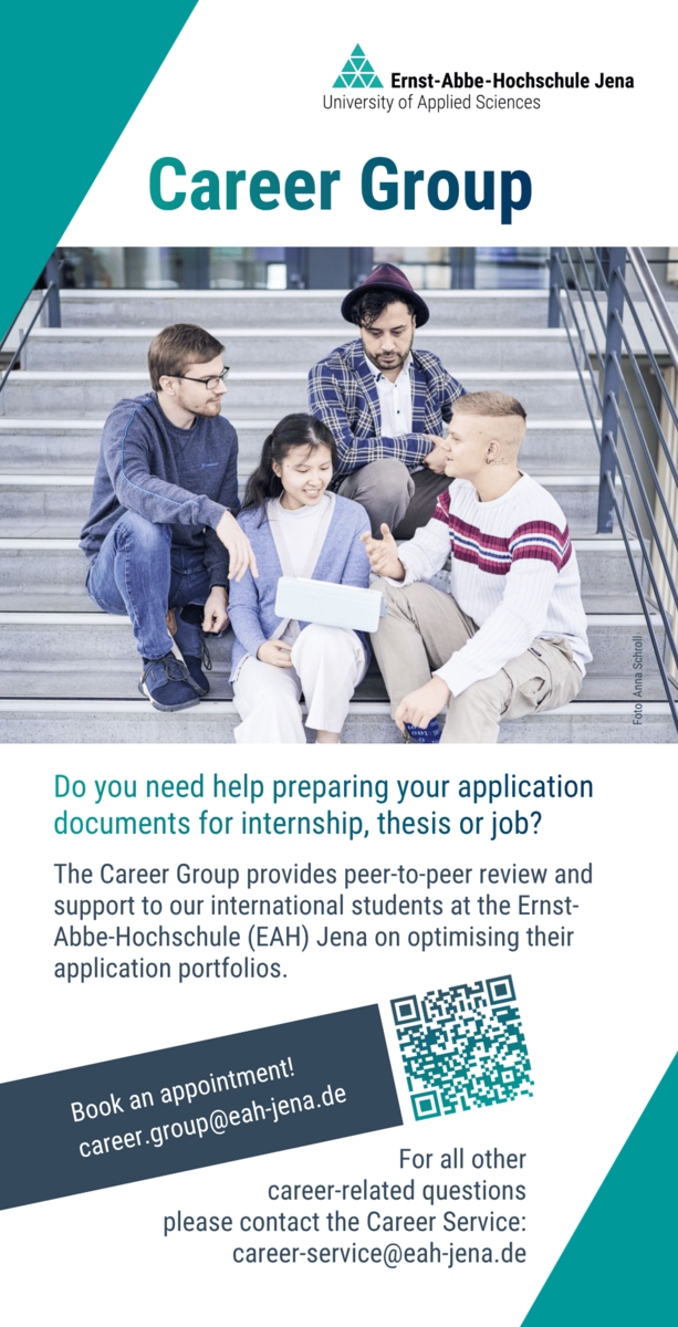 Sie sind auf der Suche nach einem Praktikumsplatz oder einer Firma für Ihre Abschlussarbeit? Career Service und International Office bieten Ihnen einen speziellen Service, unsere Career Group. Die Career Group unterstützt Sie bei der Erstellung der Bewerbungsmappe und gibt Ihnen Tipps, wie Sie ein Praktikum oder eine Abschlussarbeit finden. Die Career Group besteht selbst aus Studierenden der EAH Jena und ist keine Praktikumsvermittlung.