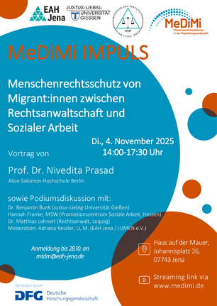 Wir laden herzlich zu den #MeDiMiImpuls “Menschenrechtsschutz von Migrant:innen zwischen Anwaltschaft und Sozialer Arbeit” am Dienstag, 04. November 2025 von 14:00 - 17:30 Uhr in Jena (und online) ein: