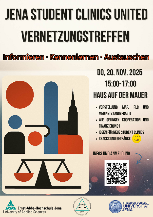 Die Migration & Participation Law Clinic (MaP) der EAH lädt gemeinsam mit der FSU Jena am 20. November ab 15 Uhr zu einem Vernetzungstreffen in das "Haus auf der Mauer". Neben der MaP wird sich auch die Refugee Law Clinic (RLC) Jena und CampusCouch der FSU vorstellen. Angefragt ist außerdem das MediNetz Jena . Das Treffen bring Vereine, Organisationen und Studierende zusammen. Es dient dem Kennenlernen, Erfahrungsaustausch und der Entwicklung neuer Projektideen. Student Clinics haben nichts mit Krankenhäusern zu tun, es geht darum, Studierenden die Chance zu geben, einen Beitrag für die Arbeit an realen gesellschaftlichen Herausforderungen zu leisten. Sie dienen als Lern- und Innovationsräume, um sich diesen Herausforderungen in einem festen Rahmen widmen zu können.