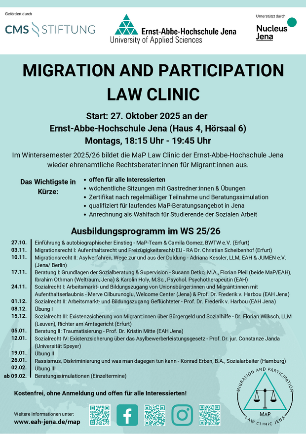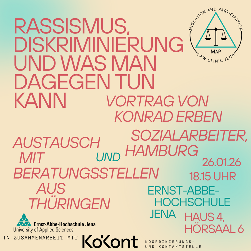 (1.April 2021) Mit Beginn des Sommersemesters am heutigen 1. April startet am Fachbereich Sozialwesen der EAH Jena das Projekt „Migration and Participation Law Clinic“ (MaP). Ziel von MaP ist es, Studierende der EAH und weitere Interessierte dazu zu qualifizieren, unter juristischer Supervision Migrantinnen und Migranten ehrenamtlich zu Fragen der sozialrechtlichen Teilhabe zu beraten und diese bei Bedarf auch darüber hinaus zu unterstützen, etwa bei Behördengängen. Im Fokus stehen dabei zunächst Hilfestellungen zur Bildungs- und Arbeitsmarktintegration, z.B. zum Zugang zu Sprachkursen, Ausbildungsplätzen, Beschäftigung oder zum Studium.