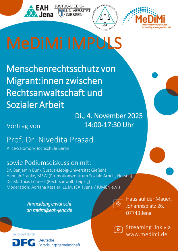 Am 4. November 2025 fand im Haus auf der Mauer in Jena eine eindrucksvolle Podiumsdiskussion zum Thema „Menschenrechtsschutz von Migrant*innen zwischen Anwaltschaft und Sozialer Arbeit“ statt. Die Veranstaltung erfolgte auf Einladung der MaP und MeDiMi unter der Organisation von Prof. Dr. Frederik von Harbou. Eingeladen waren Expert*innen aus Praxis, Wissenschaft und Recht, die das Thema aus unterschiedlichen Perspektiven beleuchteten: Prof. Dr. Nivedita Prasad (Alice Salomon Hochschule Berlin), Hannah Franke (MSW, Promotionszentrum Soziale Arbeit Hessen), Dr. Benjamin Bunk (Justus-Liebig-Universität Giessen) und Dr. Matthias Lehnert (Rechtsanwalt, Leipzig).