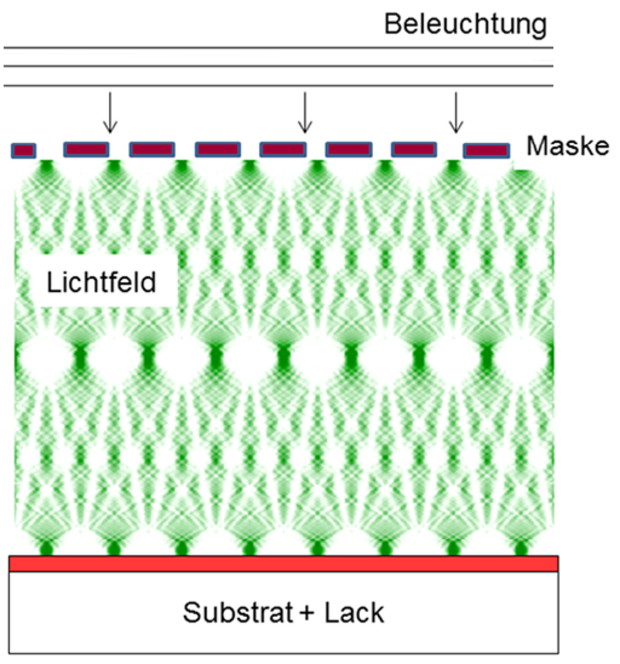 Diese enthält Ebenen, welche einer Selbstabbildung des beleuchteten Gitters entsprechen und zur Belichtung eines Fotolacks benutzt werden. Zur Fertigung von z.B. diffraktiven Gittern werden mehrere, leicht zueinander versetzte Belichtungen mit unterschiedlicher Belichtungszeit in den Fotolack eingebracht. Mit diesem Prinzip ist z.B. die in Abbildung 2 gezeigte Blaze-Gitterstruktur realisierbar. Die Versetzung kann dabei einerseits durch ein Verfahren des Substrates während der Belichtung realisiert werden, alternativ kann die Position des Schreibspots auch über die Einfallsrichtung der beleuchtenden Welle gesteuert werden. Bei Verwendung von Kreuz- anstatt Liniengitter steht in der Schreibebene ein 2D-Raster von Schreibpunkten zur Verfügung, das mithilfe Substratbewegung zur Erzeugung von quasi beliebig strukturierten 2D-Gittern verwendet werden kann. Dies eröffnet Perspektiven für neue periodische, mikrostrukturierte Elemente für optische Geräte.