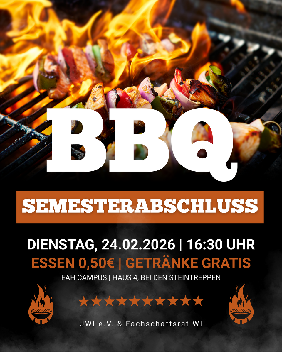 📅 24.02.2026, um 16:30 Uhr laden der JWI mit Unterstützung des FSR WI alle Studierenden, Professoren und Mitarbeiter des Fachbereich WI sowie JWI-Mitglieder und Freunde zum großen Semesterabschlussgrillen auf den